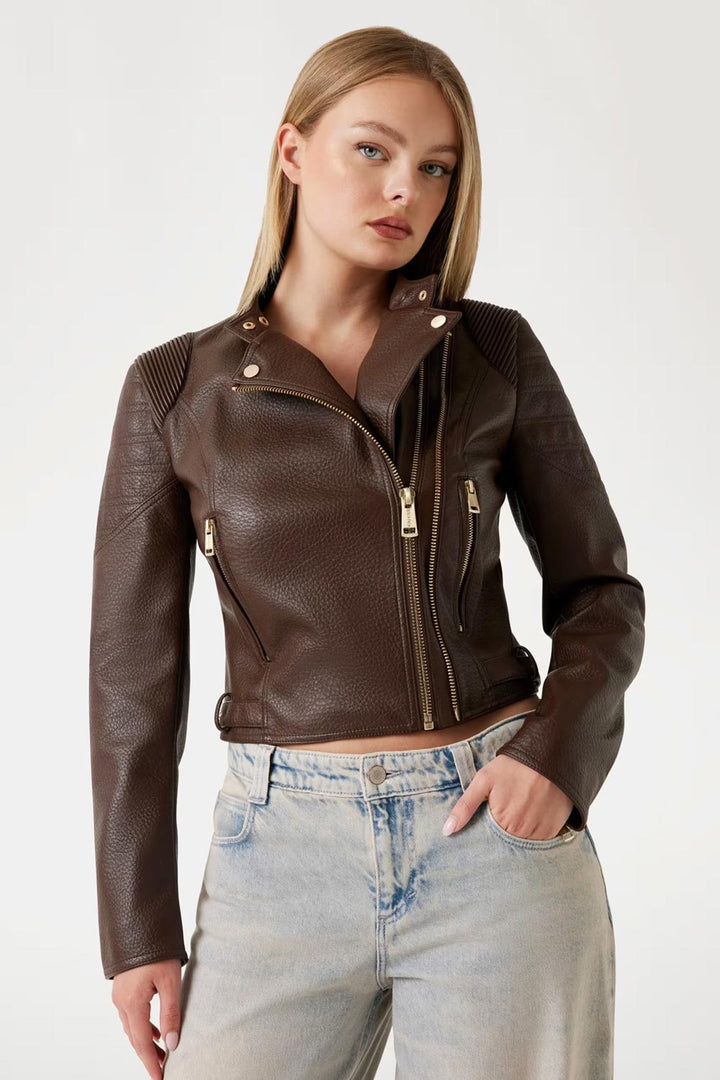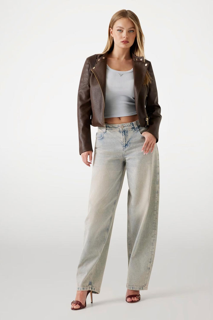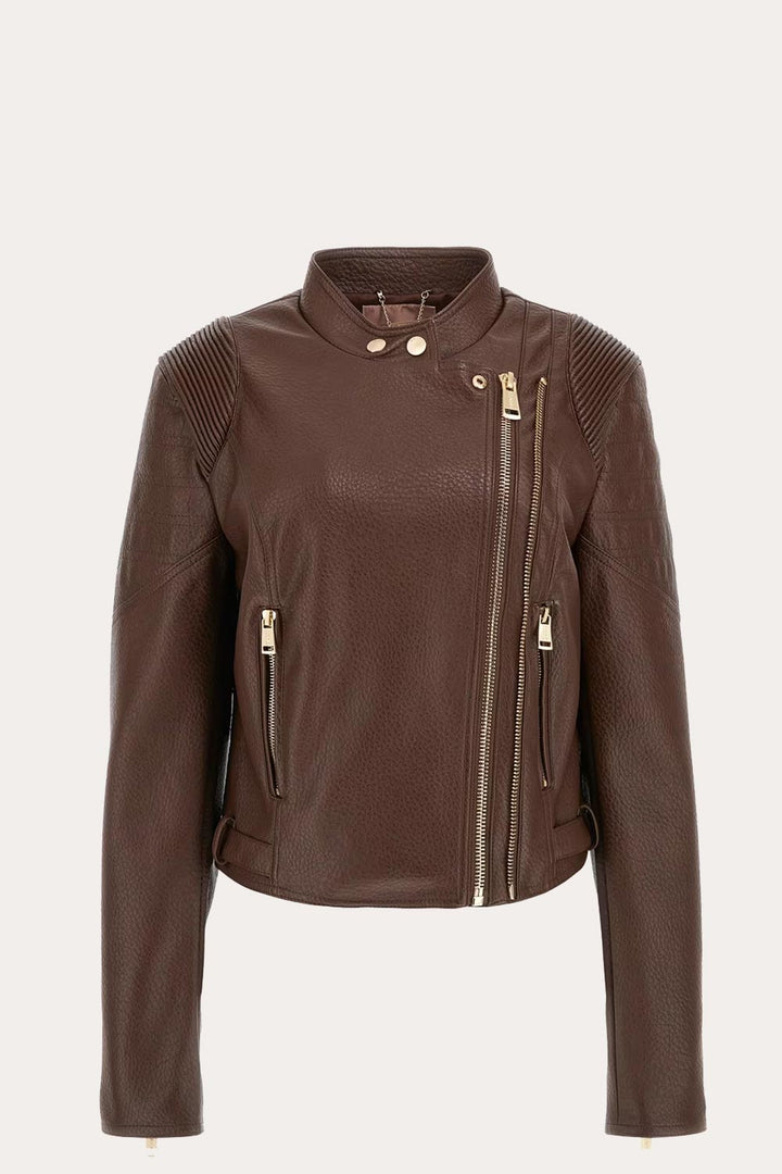 Giacca biker in similpelle Saffiano color marrone di Guess, modello W5YL19WHDS0.