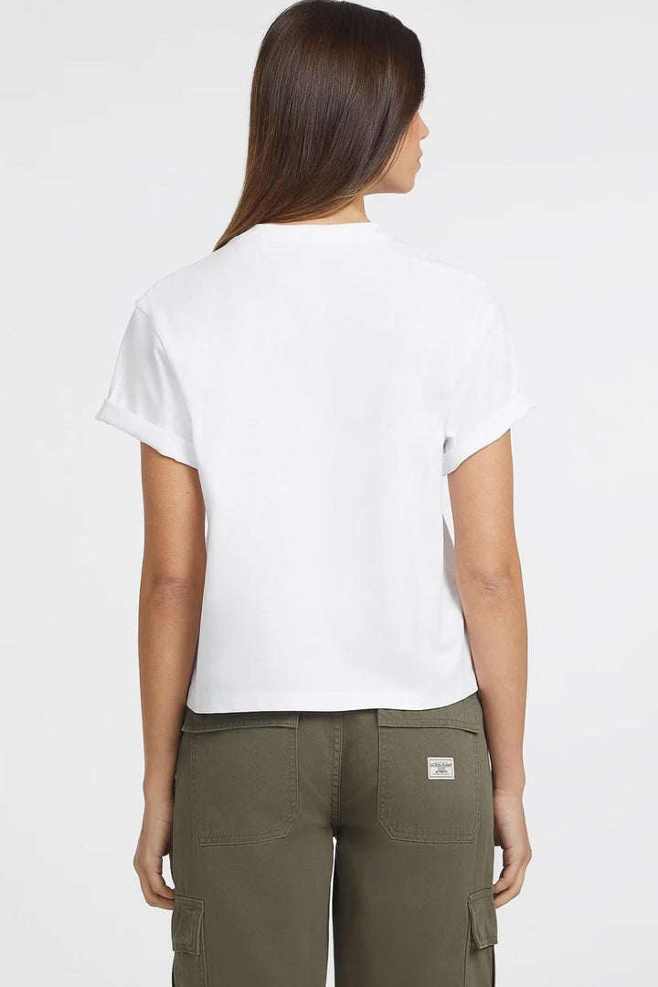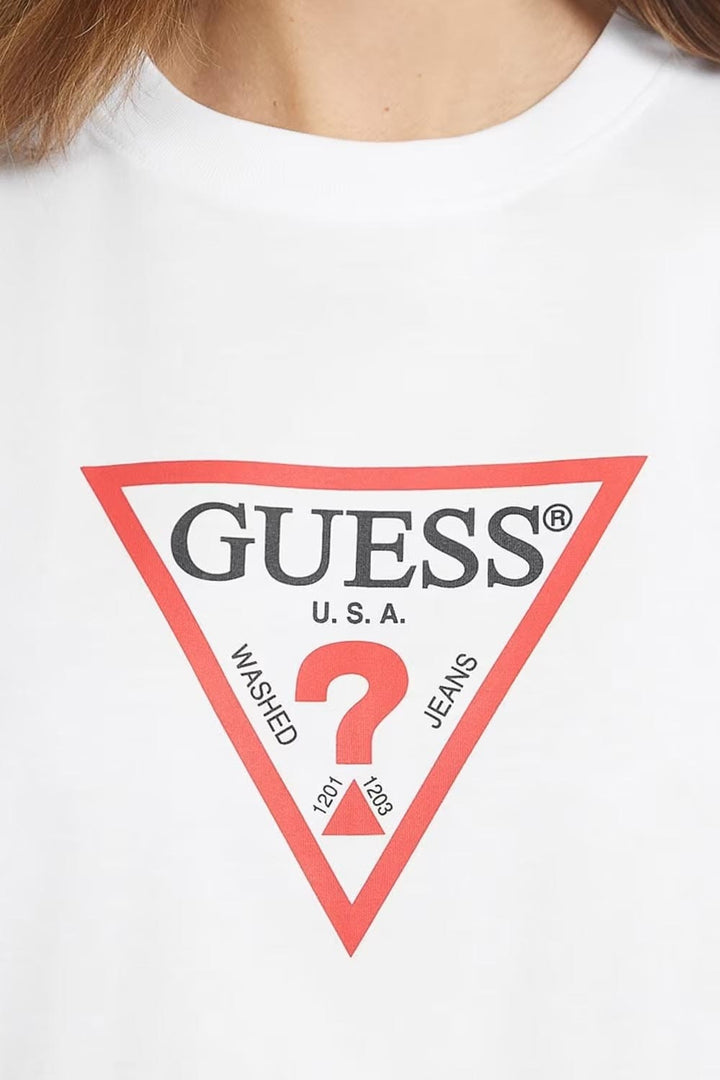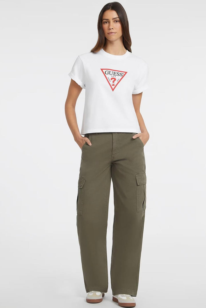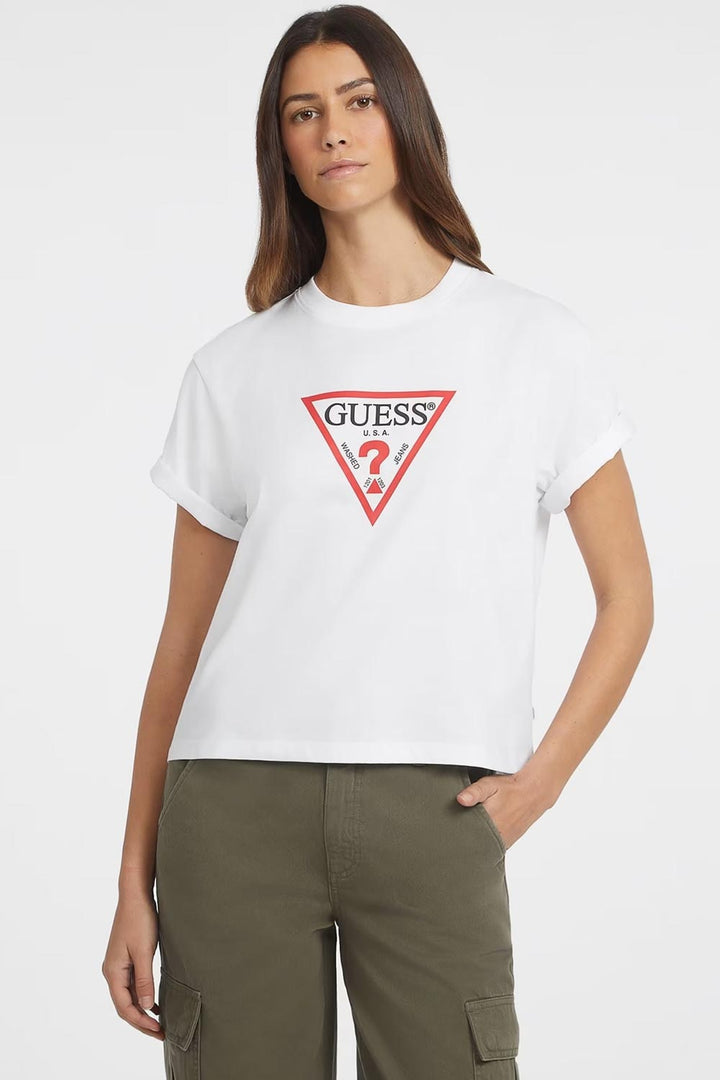 T-shirt nera boxy cropped Guess, modello girocollo W4YI73K8HM0. Con classico logo a triangolo.